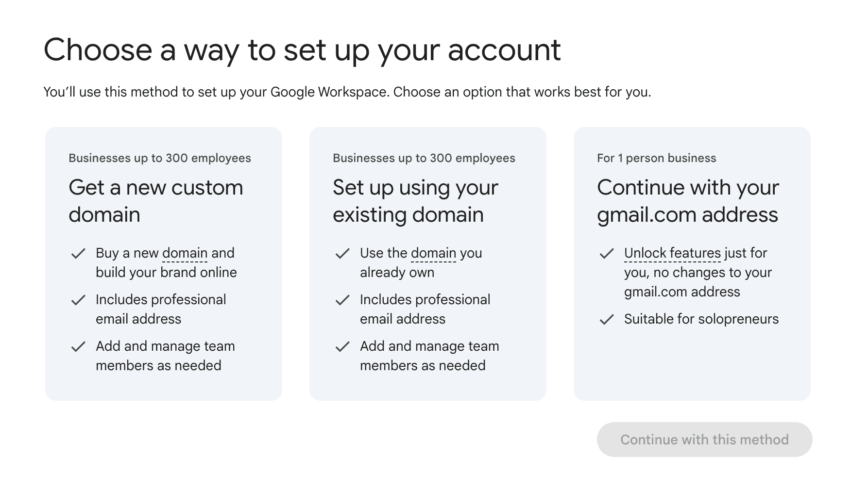 At this point, you'll see three options for setting up your Google Workspace account. This is an important decision, as your domain choice is permanent - if you want to change it later, you'll need to purchase a new domain and set up everything from scratch.